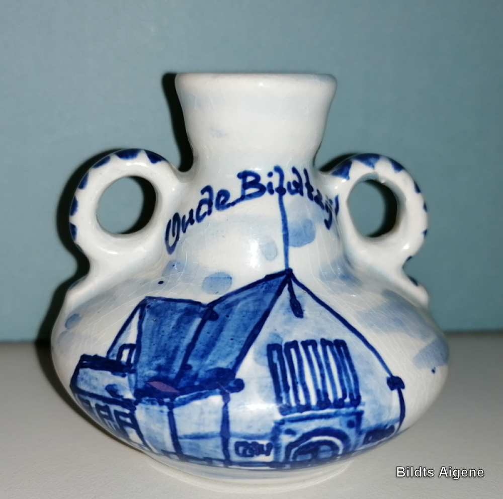 Delfts blauw vaasje met afbeelding van de gereformeerde kerk van Oudebildtzijl.