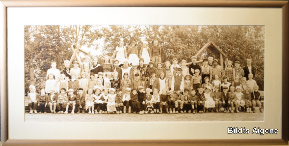 Een feestelijke schoolfoto. Kinderen zijn verkleed in kleding van vroeger. Het is onbekend welke school en welk feest dit is.