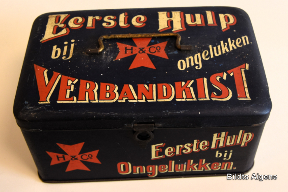 Verbanddoos van de fa. Hillen &Co. uit Arnhem, die gebruikt werd voor de EHBO