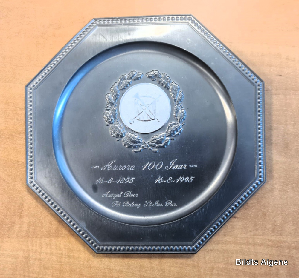 Tinnen bord, aangeboden door Plaatselijk Belang Sint Jacobiparochie i.v.m. het 100 jaar bestaan van Aurora.