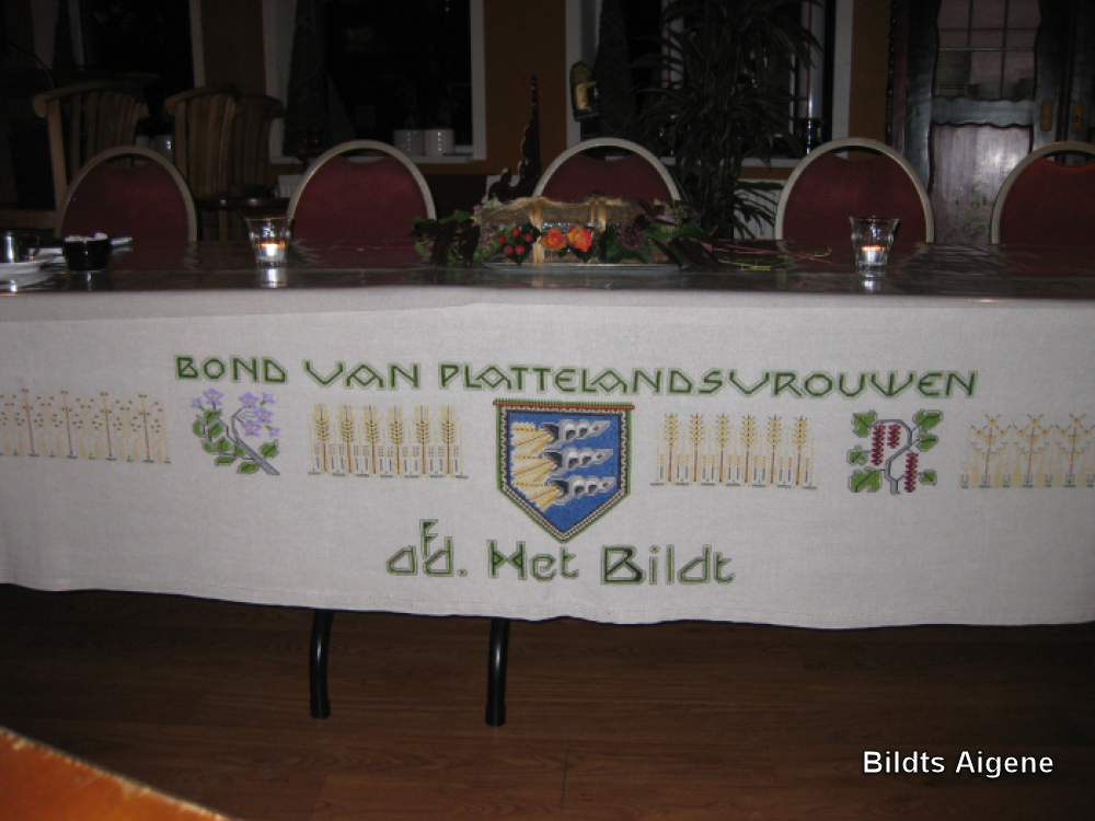 Wandkleed, gemaakt door mevr. Jensma-Enga, dat gebruikt werd bij bijeenkomsten van de Plattelandsvrouwen, de voorloper van Vrouwen van nu.