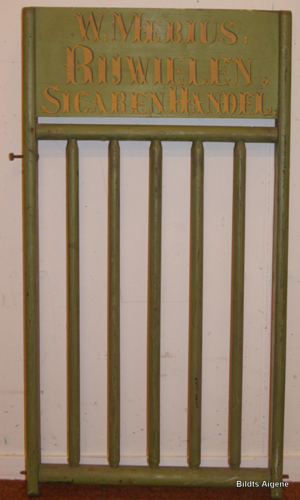 Fietsenrek met opschrift van Wiebe Mebius rijwiel-en sigarenhandel