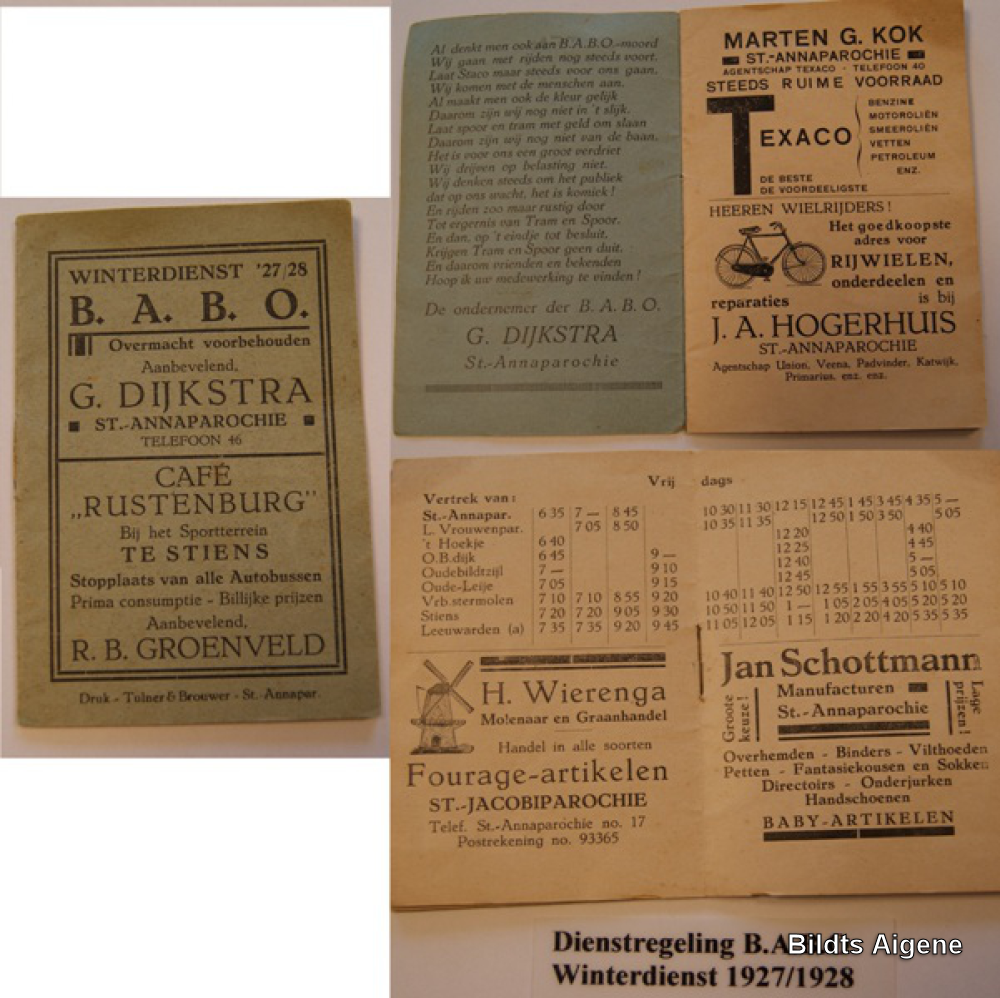 Dienstregeling Bildtse Auto Bus Onderneming, met reclame plaatselijke ondernemingen (Winterdienst)