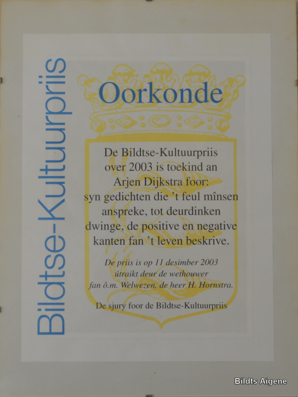 Ingelijste oorkonde toegekend voor de gedichten van Arjen Dijkstra