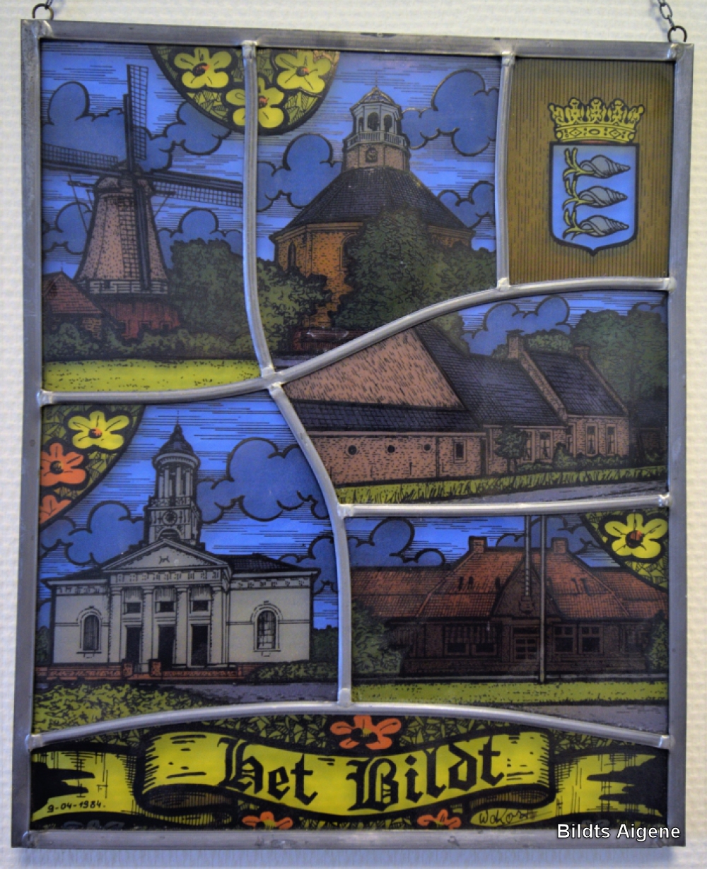 Raamhanger, glas in lood. Met uitgebeelde voorstellingen van objecten in de gemeente Het Bildt.