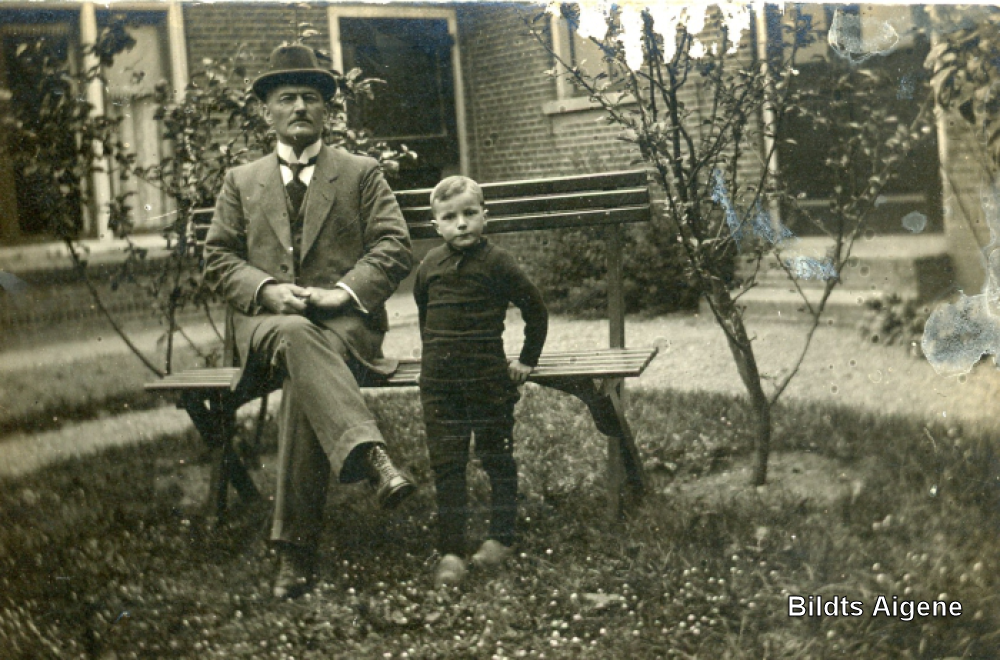 Jan Frank, hoofd der openbare lagere school, met neefje Klaas van der Veen, in de tuin van het schoolhuis