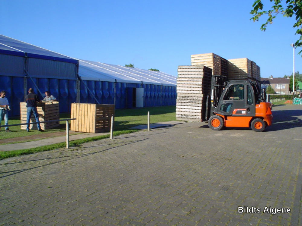 Kermisdagen, werkzaamheden bij feesttent op het sportveld.