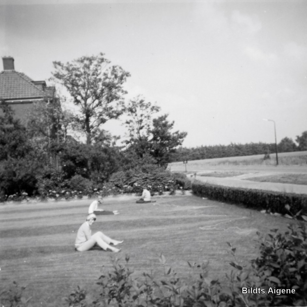 Johanna Elings met vriendinnen aan het netten breien. Netten dienden ter bescherming van de bessenstruiken op de proetuin van R. Elings.