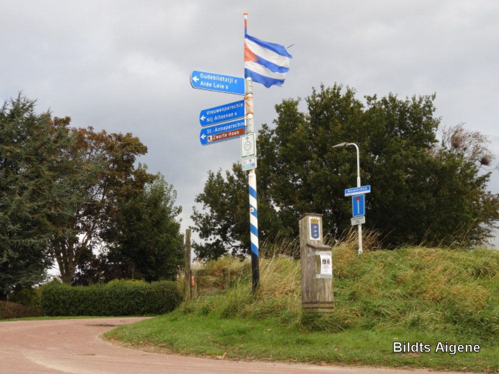 Kruispunt Koedijk-Nieuwebildtdijk met grenspaal bij Nieuwebildtzijl.