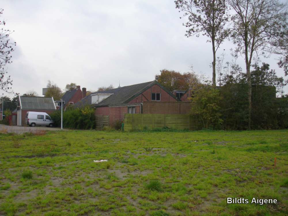 Achterzijde bedrijfspanden Fa. H.R. Hoekstra, eerder Machinefabriek D.T. Dijkstra, maakte machines voor aardappelverwerking. Op voorgrond het eerdere sportveld.