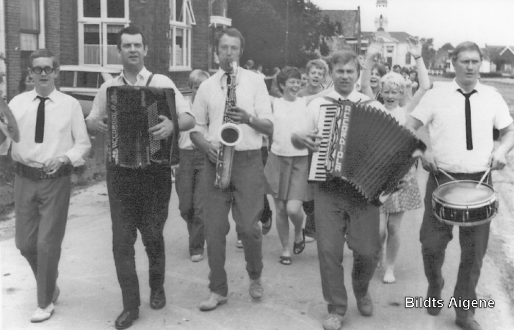 Kermis. Polonaise tijdens matinee in de bovenzaal van de Aardappelbeurs m.m.v. o.a. Gerard Wiersma en Ben Mol. Tussen de muzikanten Tineke Visser, Frootje Keizer en Froukje Runia.