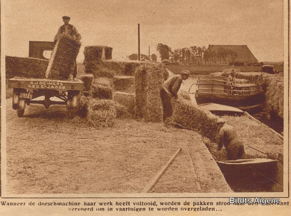 Het lossen van stro in schepen door G. Beimers aan de Langhuisterweg.