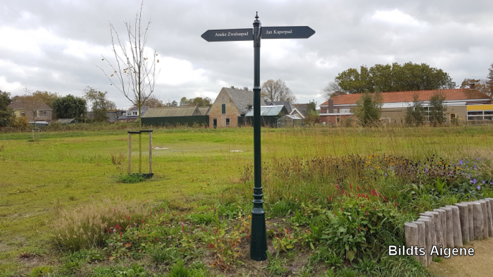 Park, het eerdere sportveld, straatnaambord met namen gesneuvelde Bildtse verzetsstrijders in de tweede wereldoorlog.